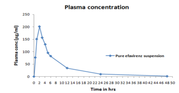The method described was applied for the determination of EFA concentrations from rat plasma after receiving a single oral dose of EFA (30 mg). Fig. 6 presents the mean plasma concentrations of EFA at various time points (30 min, 1, 2, 3, 4, 5, 6, 12, 24 and 48 h) EFA was detectable up to 48 h after the dose. The plasma concentration of EFA shows maximum concentration (Cmax, fig. 7) of EFA at 2 hr to be 200 µg/ml.