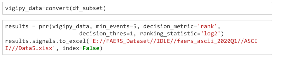 FAERS [11] is a primary resource freely available virtually available on this link (FDA Adverse Event Reporting System (FAERS) Database | FDA). Data collection is done and validated authentically. The dataset is available in both ASCII and CSV formats. In the period of one year from 2019 to 2020, about 3 million data records were downloaded and extracted. FAERS dataset. Initially, the data in the FAERS dataset is confusing and distributed among multiple tables. The data is converted into a comprehensible format and combined using the primary ID and the case ID. Due to the humongous size of the resultant dataset, it is necessary to detect significant drug-ADR associations. These associations are calculated using the Proportional Reporting Ratio (PRR). The association score greater than or equal to 3 is selected for further processing. Finally, the outcome of prior experiments results in a pre-processed FAERS dataset, which is integrated with other data sources. ADR is predicted based on both drug and patient characteristics. The code snippet shows the calculation of the proportionality reporting ratio to detect the most relevant association between drug name and adverse drug reaction. The outcome of this snippet is shown in fig. 3.