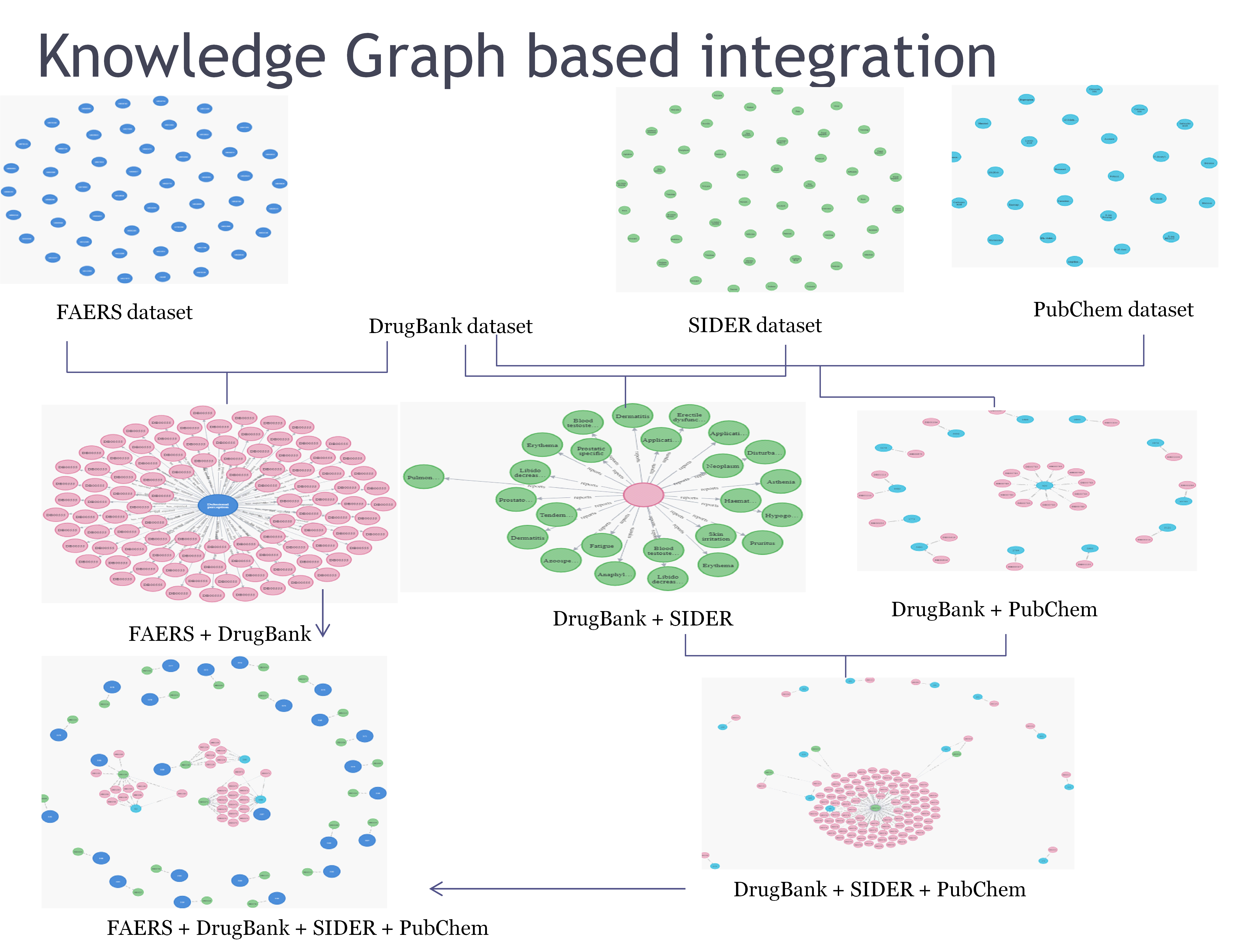 Knowledge graphs are constructed using nodes of different datasets like drugs, target proteins, enzymes, pathways, indications, and adverse drug reactions. In fig. 5, information derived from knowledge graphs is used for identifying side effects as well as detecting probable ADR for the prescribed medicines.