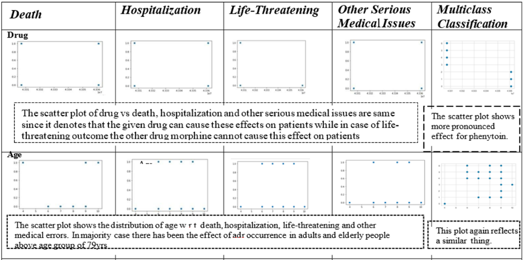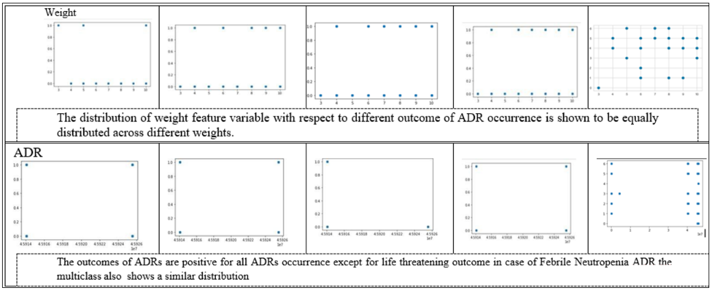 Scatter plots are used to visualize the distribution of feature variables concerning the target. They are applied to classify the outcome of adverse reactions. The target outcomes for the other dataset are reflected in table 4.