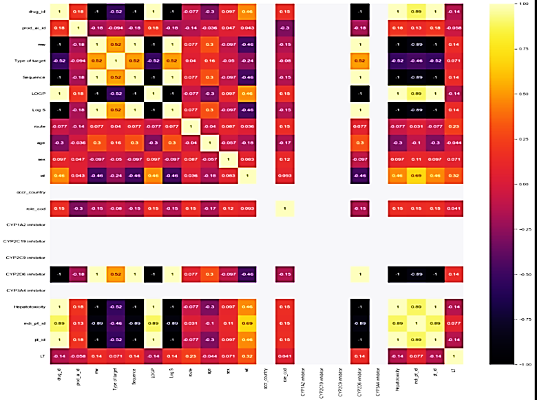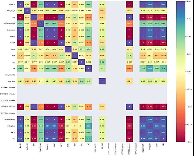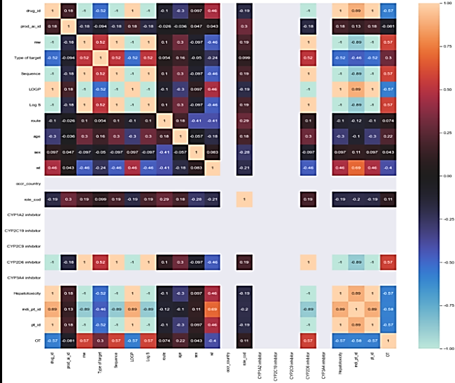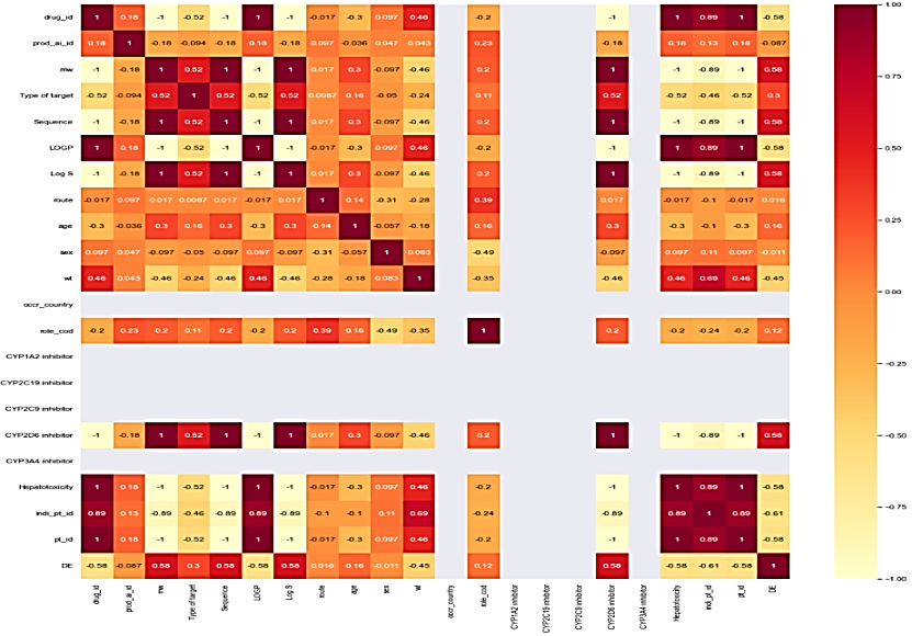 Analyzingthecorrelationmatrixthecollinearityamongfeaturevariablesisobservedbased on Pandas and NumPy packages [17-18]. A significant correlation was found between commercial drug names and product substances. The rationale for removing "drug name" instead of "prod_ai" includes:-