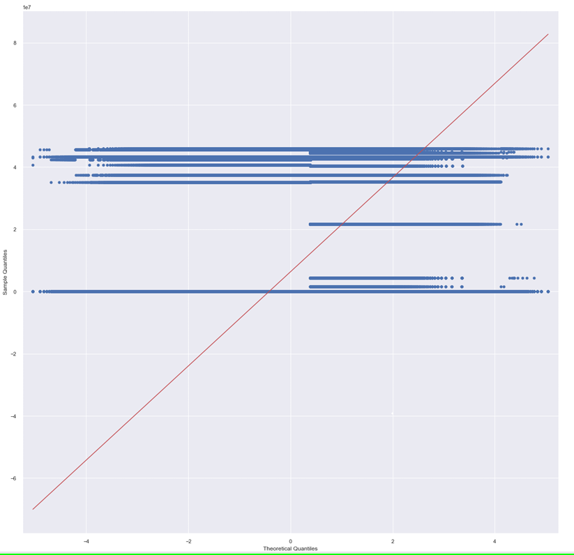 QQplots [19] are used to determine the type of distribution for a random variable, such as Gaussian, Uniform, Exponential, or Pareto distributions. By analyzing the Q-Q plot, you can identify the distribution type simply by examining the plot's characteristics. The Q-Q plot based on the distribution of the X feature variables is shown in fig. 8. The distribution is not normal.