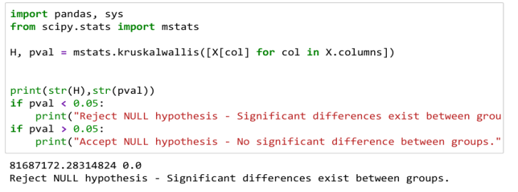 Since the value of p is less than 0.05, that signifies significant differences exist among groups and therefore the NULL hypothesis is rejected.
