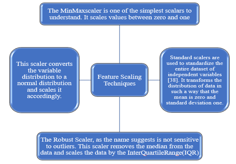 The above diagram shows that the drug feature variable, as well as active product ingredients, have higher range values in comparison to other feature variables. Therefore, feature scaling is applied to scale the range of independent variables into some common boundaries [20]. Different techniques for scaling are discussed in fig. 9.