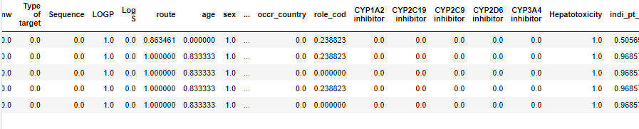 | Drug | Prod ai | mw | Type of target | Sequence | LOGP | LogS | Route | Age | Sex | % | Occrcountry | Role cod | Inhibitor | CYP1A2 inhibitor | CYP2C9 inhibitor | CYP206 inhibitor | CYP3A4 inhibitor | Hepatotoxicity | Indi pt | Pt | Outccod | |