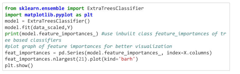 To identify the most significant features in the dataset, imgded methods are used, as they combine the advantages of both wrapper and filter methods. These methods consider feature interactions while keeping actions while keeping computational costs manageable [22]. The imgded method employed for feature selection is the Extremely Randomized Trees Classifier (Extra Trees Classifier) [23]. The Extra Trees Classifier is an ensemble learning technique that aggregates the results of multiple decor-related decision trees, collected in a "forest," to produce the classification result. The snippet code for the imgded feature selection is shown in the following section below.