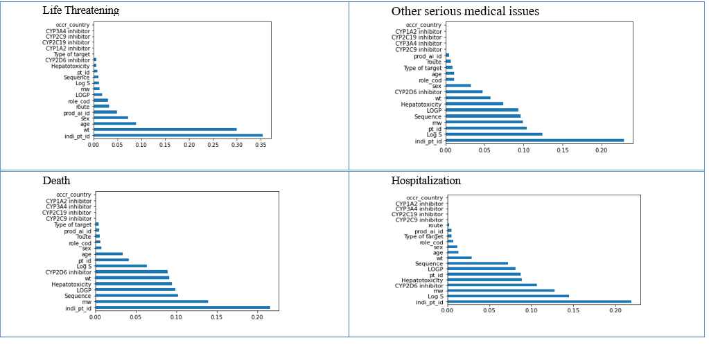 After applying feature selection to the datasets, the features that were not contributing meaningfully to the outcome variable were eliminated, and only the filtered number of features were considered for further analysis. In only one feature selection concerning life-threatening outcomes, the feature variables have a low feature selection value as compared to other outcome datasets. Therefore, many features are eliminated in the given dataset for further processing.