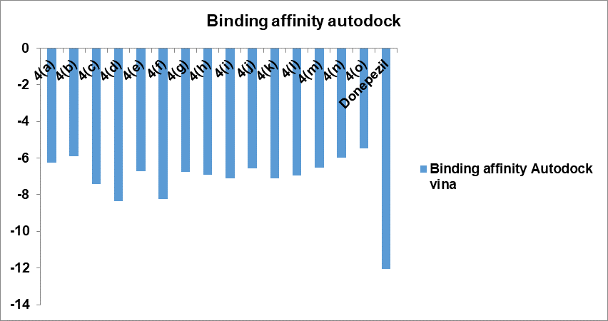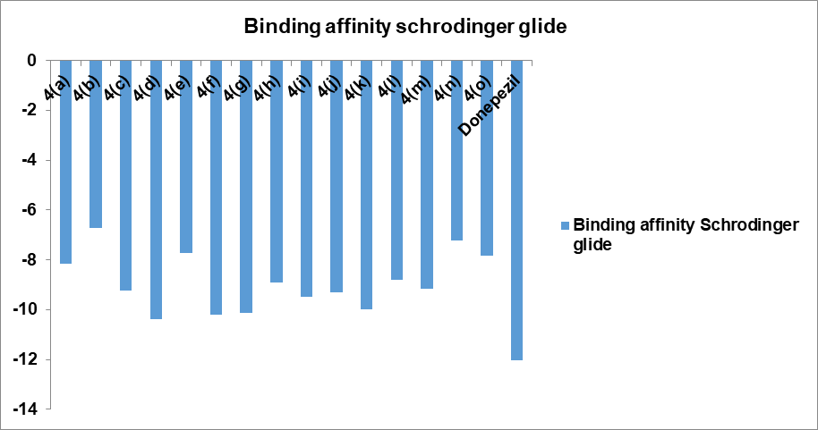 Based on their docking score, all drugs demonstrated similar binding to AChE (in comparison to donepezil). Docking scores for compounds were in the range-5.467 to-8.342 using Auto dock and -10.384 to-6.708 using Glide. Donepezil binds to both CAS and PAS sites of the enzyme. The compounds 4(d), 7-(2-(9H-carbazol-9-yl)-2-oxoethoxy)-2H-chromen-2-one and 4(f), 7-(2-oxo-2-(10H-phenothiazin-10-yl) ethoxy)-2H-chromen-2-one having the highest docking scores using both the tools. All the compounds also displayed more or less the same pi-pi stacking interactions, hydrophobic interactions, polar interactions etc. Molecular docking results revealed that the compounds 4 (d) and 4 (f) possess acetylcholinesterase inhibitory properties by binding to both CAS and PAS in the active sites of AChE. It is also supported by previously published articles that the coumarin derivatives exhibit anticholinesterase activity by dual binding mode in the active sites of AChE [25]. Moreover, the compounds showing dual binding site interactions as Donepezil, at molecular level of inhibitory activity, are akin to exhibit better acetylcholinesterase inhibitory properties [26].