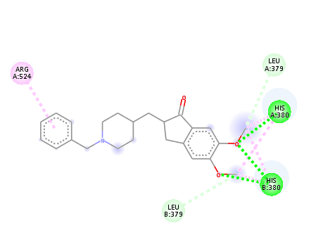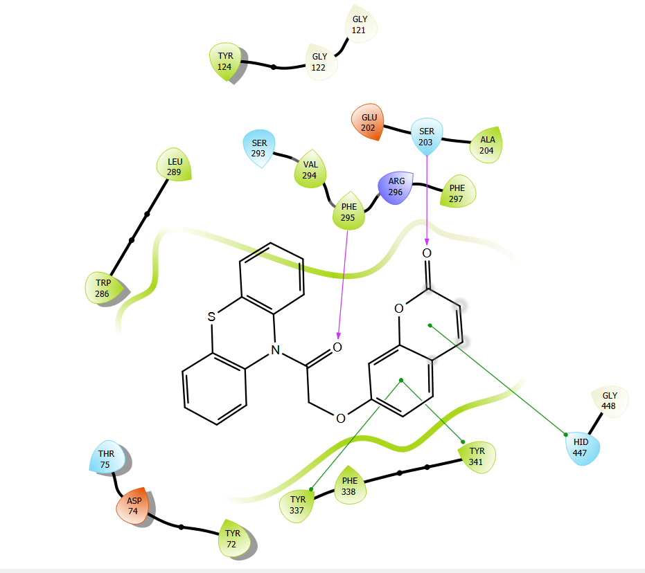 | Donepezil | HIS 447 SER 239,SER 203 | PHE 295, PHE 297 | TRP 286, TYR 341, TYR 124, TYR 72, ASP 74. | ARG 524,HIS 380 | LEU 379 |