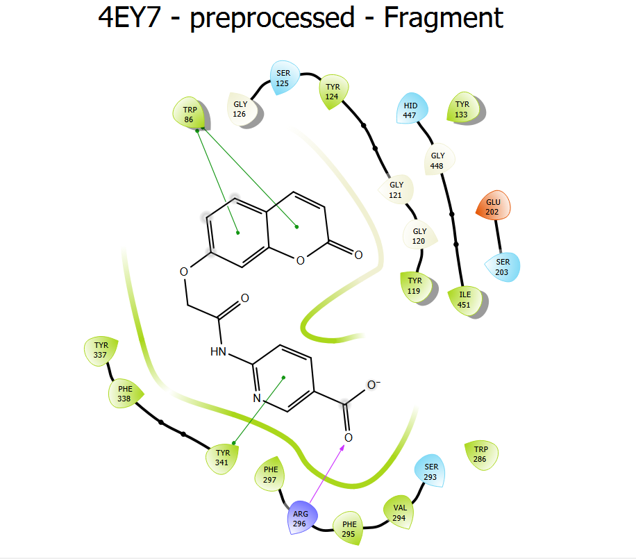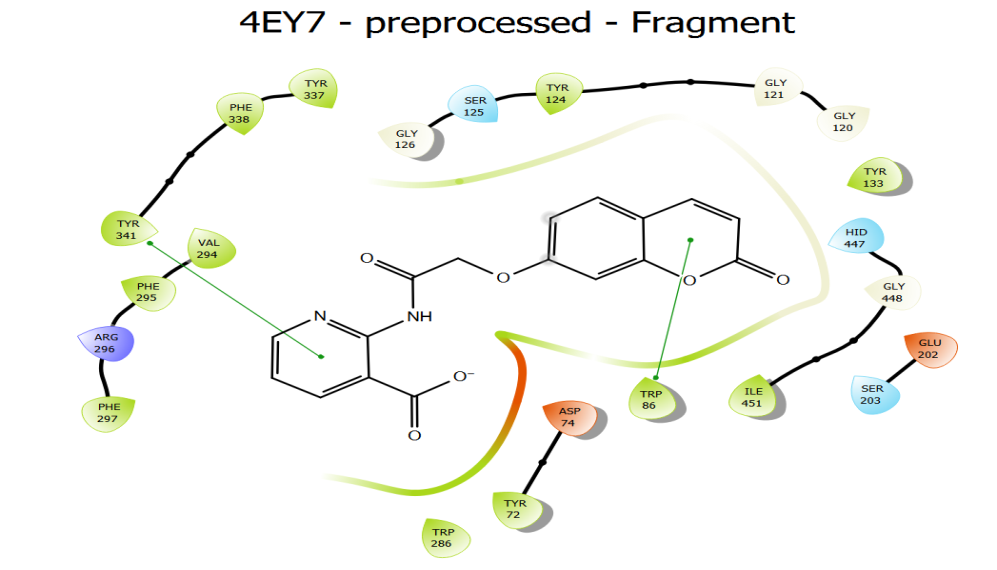 | 4 (d) | HIS 447 SER 203 | THR 75, GLY120 | TRP 286, TYR 72, TYR 341, ASP 74, TYR 124 | ALA 397,HIS 381 | GLU 396,ARG 393,TYR 382,HIS 381, THR 383,ASP 400,ASP 384 |
