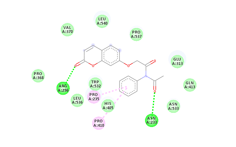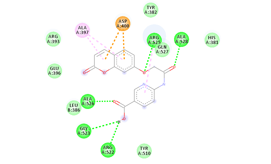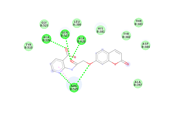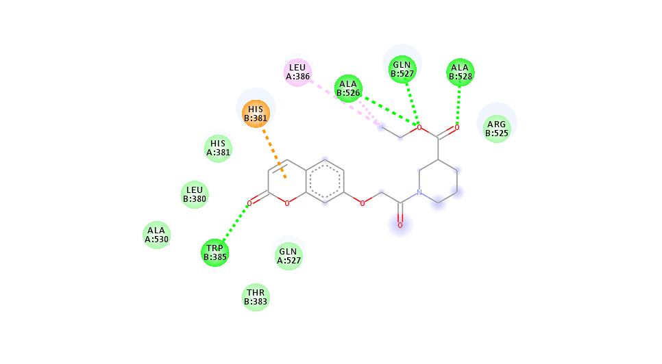Fig. 8 depicts the interaction between hAchE and the compound 4(d) shown by AutoDock tool. The carbonyl group at the coumarin moiety forms a conventional hydrogen bond with ALA 526. Both the rings of coumarin forms pi-pi interactions with ALA 528 and ARG 525. Moreover, the ligand shows Vander Waals interactions with HIS 381, LEU 386, ARG 522, GLN 527 and TYR 382 amino acids in binding pockets.