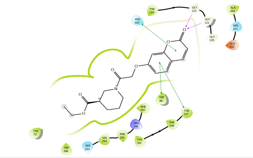 Compound 4 (f) and donepezil had docked scores of-10.211 and-12.040 kcal/mole, respectively. The interaction between compound 4 (f) in its ideal docking position and the amino acids in the hAchE active site is shown in fig. 7. In the catalytic triad of the CAS area, the pyrone ring of coumarin produced pi-pi stacking and polar contacts with HID 447, while the carbonyl group of the pyrone ring made a hydrogen bond with SER 203. The coumarin's benzene ring displayed pi-pi stacking with TYR 337 at the anionic subsite. Furthermore, in the anionic subsite, compound 4 (f) demonstrated hydrophobic contacts with PHE 338 and electrostatic interactions with GLU 202. Compound 4(f)'s amide linkage's carbonyl group established a hydrogen bond with PHE 295 and a hydrophobic interaction with PHE 297 at the acyl binding pocket. Compound 4(f) developed a hydrophobic contact with ALA 204 at the oxyanion site after interacting with glycine residues (GLY 121 and GLY 122).