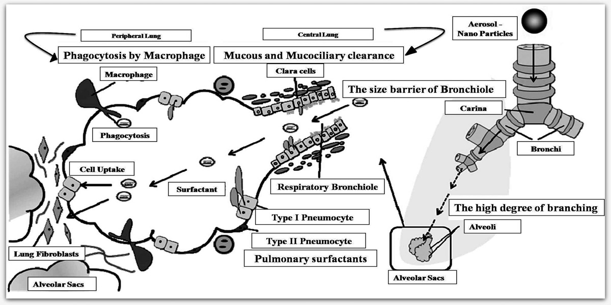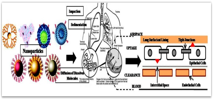 Nanoparticle deposition in the lung and respiratory tract is determined by diffusional displacement as a result of thermal motion of air molecules combined with particles in the exhaled and inhaled air streams [62, 63]. Deposition occurs in all regions of the lung: the airways and the alveoli, usually depends on the particle size, shape and ventilation parameters. With truncate diameter in particle below 500 nm, the deposition augments in all regions of the lung due to the increasing diffusional mobility [61]. The deposition mechanism and uptake of nanoparticles in the lung along with different cell types were illustrated in fig. 4. Physical properties that show an outstanding role on the particle size of the inhaled suspension are osmolarity, pH, viscosity and ionic strength. If the values for osmolarity and pH are not in the normal range coughing, bronchoconstriction and irritation of the lung mucosa is induced [64, 65] and also it may leads to lung cancer incidence [66].