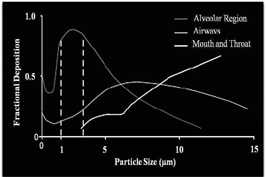 Fig. 3: Effect of particle size on the deposition of aerosol particles in the human respiratory tract following a slow inhalation and a 5 s breathe hold. Smaller particles deposit in the alveolar region whereas larger particles deposit in the airways or mouth and throat. Particles less than 1 µm can be exhaled, thereby bringing down deep lung deposition [51]