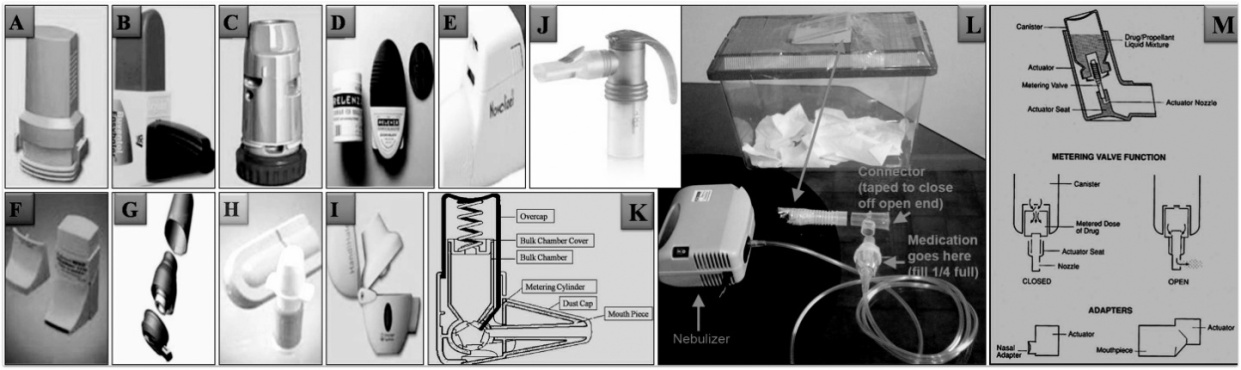 Fig. 6: Images of some currently available inhaler devices: Dry Powder Inhalers-(A) Aerolizer®(B) Easyhaler®, (C) Turbohaler®, (D) Diskhaler®, (E) Novolizer®, (F) Clickhaler®, (G) MAGhaler®, (H) Spinhaler® and (I) Handihaler®, Nebulizers–(J) Pari Trek S® Portable Nebulized (K) Mechanism of Nebulizer (L) Nebulizers designed for Mice and Rat, Meter Dose Inhalers–(M) Image and Mechanism