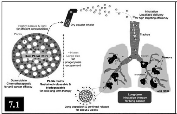 In a study performed by Hershey et al. treated 24 anesthetized dogs with developed stages of spontaneous primary lung cancer or metastases with doxorubicin or paclitaxel aerosols administered twice weekly [178]. Tumor suppression was achieved in 25% of dogs with significant tumors without any systemic side effects usually associated with i.v. administration of these drugs and without pulmonary toxicity in the dogs treated with paclitaxel. In a studies demonstrated by Ajay Gautham et al. clearly explained the aerosol delivery of PEI–p53 complexes which inhibits B16-F10 lung metastases through regulation of angiogenesis [179]. Insoo Kim et al. in 2012 and his group fabricated doxorubicin-loaded highly porous large PLGA microparticles for the treatment of metastatic lung cancer via inhalation and they found Dox PLGA MPs have great potential as a long-term inhalation agent for the treatment of lung cancer (fig 7.1 & 7.4) [27]. At present, the study of inhaled doxorubicin combined with platinum-based therapy by Gregory et al. is in the phase I/II clinical trial for advanced NSCLC [180].