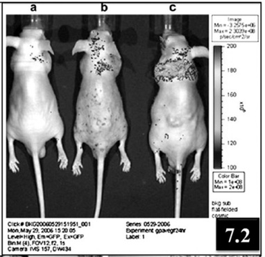 Fig. 7.2: The invivo fluorescence images of tumor-induced mice following aerosol delivery 24 h later by treatment with different nanoparticles solution: PBS-treated group (a), GP-Av-treated group (b), and GP-Av-bEGF conjugate-treated group (c). FITC green fluorescence spectra were obtained from live mice xenografted with the human lung adenocarcinoma cells (A549) [11]