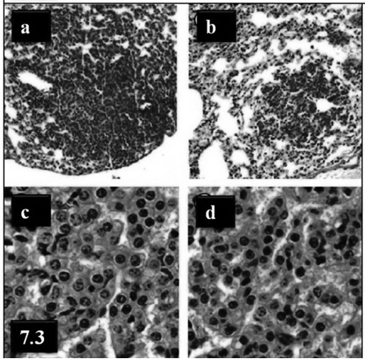 Fig. 7.3: Efficacy of aerosolized Poly E against B(a)P-induced mouse lung tumorigenesis. Light photomicrographs of representative adenomas from the control group (a & c) and the Poly E group (b & d) at 100x and 400x magnifications, respectively [21]