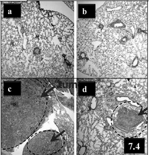 Fig. 7.4: Histology of lung tissues in the four study groups at 4 weeks after B16F10 cell implantation (5 X105 ea, 0 day) and/or pulmonary administration of Dox PLGA MPs (5, 14 day). (a) age-matched treatment naive control mouse; (b) Dox PLGA MP administered mouse; (c) B16F10-implanted mouse; and (d) B16F10-implanted and Dox PLGA MPs administered mouse [27]