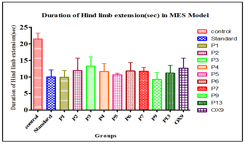 Results: In MES test, the duration of tonic hind limb extension was significantly reduced by all FBTDs at a dose of 100 mg/kg except, P-3, and OX-9 whereas in strychnine induced model, the seizure latency was sustained by all FBTDs at a dose of 100 mg/kg except P-4. P-7 and OX-9.