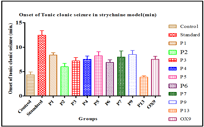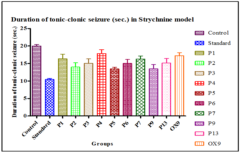 Strychnine is an alkaloid which is an inhibitor of glycine (inhibitory neurotransmitter) synthesis. It is an antagonist to excitatory neuro transmitters like AMPA and NMDA and it also opposes Ca2+induced excitotoxicity in the neurons. These factors are proepileptogenic and precipitate seizures. Hence, inhibition of glycine leads to clonic and tonic seizures in laboratory animals. Thus, it is used as a research tool to induce seizures in the animals. It was revealed that diazepam as a standard drug (5 mg/kg) exhibit extremely significant (***P<0.001). P-2, P-5, and P-9 exhibit the very significant effects (**P<0.01). P-3, P-6, and P-13 exhibit significant (*P<0.05) antiepileptic effect as compared to control by prolonging onset time of seizures (Latency) and reducing the duration of tonic-clonic seizures.