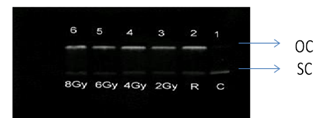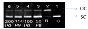 To study the protective effect of Fr on DNA strand breaks, the pBR322 plasmid DNA sample (250ng in 0.01M sodium phosphate buffer) was exposed to EBR at a dose rate of 2Gy/min, 4Gy/min, 6Gy/min, and 8Gy/min for dose fixation in the absence of drug. After irradiation, the DNA samples were electrophoresed on 1% agarose gel stained with Gold View containing TAE buffer at 100V for 50 min and photographed using UV transilluminator. After dose fixation (i.e. 4Gy/min) another sets of vials containing pBR322 DNA samples was randomly divided into 6 vials. Vial I: normal control i.e. untreated DNA, vial II: radiated control exposed to electron beam, vial III, IV, V and VI: treated with 50, 100, 150 and 200µg of Fr extract respectively and all the vials were exposed to EBR at 4Gy except control. After exposure the DNA samples were electrophoresed on 1% agarose gel stained with Gold View containing TAE buffer and photographed using UV transilluminator.