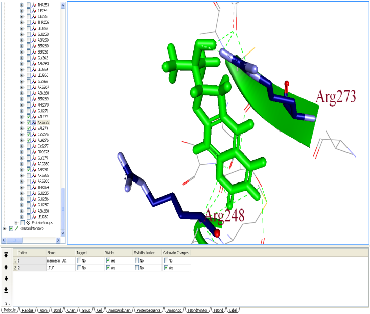 Hence the protection of normal tissues from radiation damage is of primary importance. Small molecules such as PRIMA-1, RITA, and pifitrin-α, changes the sterical conformation of mutated p53 back to the conformation of wild-type p53 [33]. A novel concept is targeting tumor suppressor p53 as a key player of apoptosis to reach radiosensitization of tumors and in turn radioprotection of normal tissues. Hence inhibition of the function of wild-type p53 using Fr constituents may suppress induction of apoptosis in normal tissues by targeting ARG 248 and ARG 273 and hence, may prevent radiotherapy associated side effects in cancer patients and protect the normal cells damage.