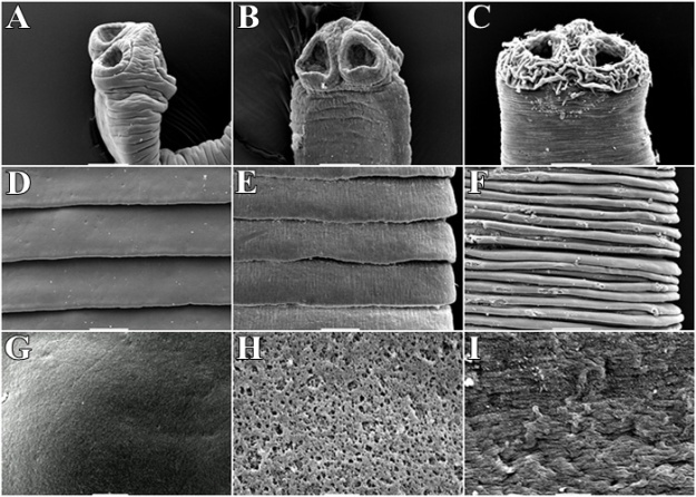 Fig. 1: SEMs of H. diminuta: A-control: scolex with suckers; B-S. occidentalis: shrunken scolex; C-PZQ: sloughed off tegument near suckers. All bars, 50 μm. D-control: typical trapezoid proglottid velvety appearance, E-S. occientalis: infoldings at each proglottid terminal; F-PZQ: intense folding at the edge. G-microthrix with velvety appearance, H-microtriches sloughed off, I-deep pits and ridges are very prominent