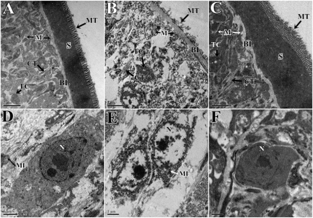 Fig. 2: TEMs of tegument of H. diminuta: 2A-Control: with intact microthrix (MT) above the syncytium (S), connective tissue (CT), superficial musculature (M) and basal lamina (BL). 2B-S. occidentalis: MT are totally damaged and clumped, exposing BL and CT, sparse syncytium with few tegumentary cytons (TC) intense vacuolization; degradation of longitudinal and circular muscle layers. 2C-PZQ: MT disorganized and stripped off. All bars, 2 μm. 2D control: distinct nucleus (N) with nucleolus, condensed chromatin, electron dense nucleoplasm and mitochondria (MI) with cristae. 2E-S. occidentalis: vacuolized nucleus with electron lucency inside, mitochondrial damage observed; 2F-PZQ Nuclear membrane irregular. All bars, 1 μm