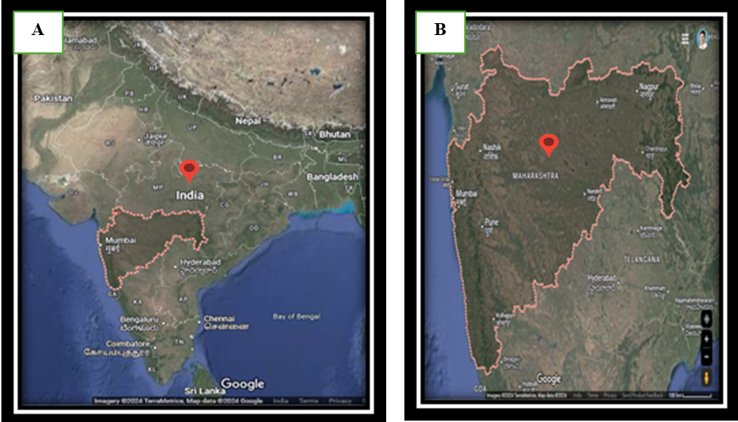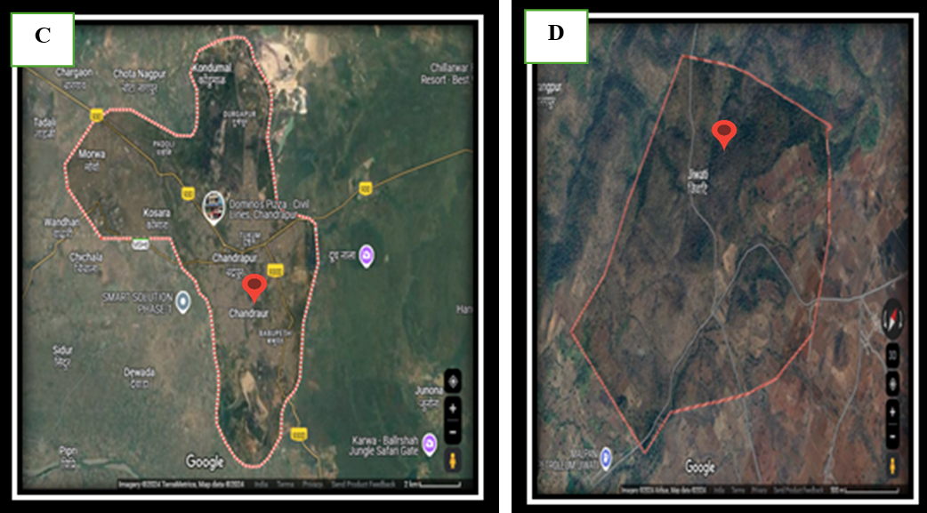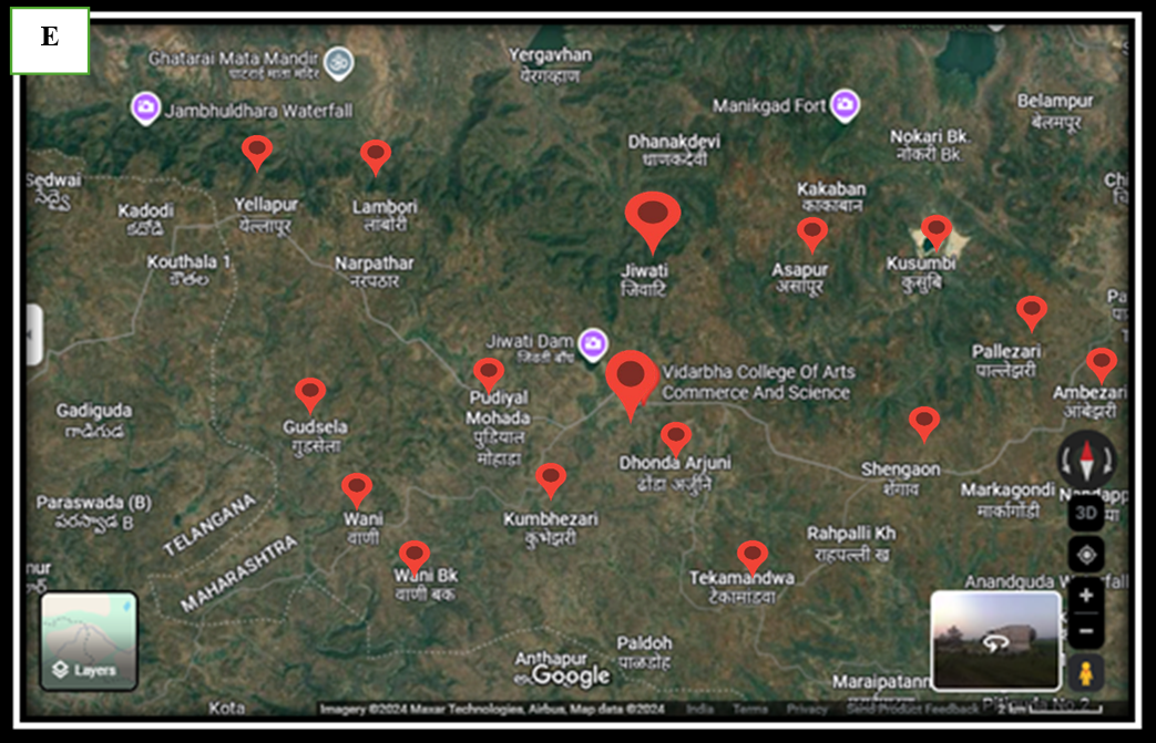 The current investigation was carried out in multiple villages within Jiwati Tehsil in Chandrapur District, Maharashtra, India (fig. 1-A-E). Chandrapur District, located in the eastern region of Maharashtra, is known for its rich natural resources, diverse geography, and historical significance. It spans a total area of 11,443 square kilometers and lies between latitudes 19° 30' and 20° 45' North and longitudes 78° 46' and 80° East. The district experiences a predominantly dry and partly humid climate, receiving an average annual rainfall of approximately 1300 mm [14]. Winters are characterized by moderate temperatures ranging between 18 °C and 30 °C, creating pleasant weather conditions. Around 37% of the district is covered by dense forests, and it forms part of the Deccan Plateau, which is home to dry tropical deciduous forests. Physiographically, Chandrapur District (fig. 1C) is divided into two distinct regions: the Upland Hilly Zone and the Plain Zone. The plain region, primarily found around the Wardha River, features a flat and widely dispersed landscape. In the northern section of the Wainganga Valley (Brahmapuri Taluka), extensive alluvial floodplains dominate the terrain, while the southern part of the valley transitions into a rolling topography with scattered hills. The southwestern portion of the district, within Penganga Valley, has limited flat terrain. The Upland Hilly Zone is situated between the Wardha and Wainganga Rivers, characterized by rugged and elevated landscapes [15].