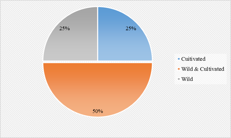 A. ficulneus L. is strictly wild, with a recorded frequency of 48%. The identified fruit vegetables belong to the genus Abelmoschus within the family Malvaceae, with their immature pods commonly used in traditional vegetable preparations. In the study area, tribal communities and local villagers incorporate immature okra pods into a variety of flavorful dishes, including stir-fried okra (Bhindi Fry), okra curry (Bhindi Masala), and stuffed okra (Bharwa Bhindi).
