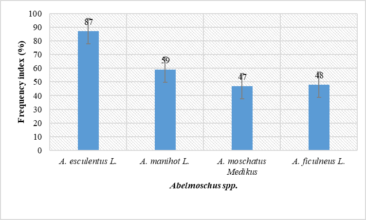 Collecting plant specimens helped reduce confusion arising from the use of multiple common names for a single species or the application of a single name to different species. In some cases, local informants referred to the same species using two or more commonly used names, leading to inconsistencies in identification. The pressing plant specimens were placed in the college's Department of Botany following verification. Additionally, the International Plant Name Index (IPNI) repository [18] and The Flora of Marathwada [17] were used to confirm the botanical nomenclature of the discovered species. The geographical coordinates of the studied vegetables are Latitude-19.605122’ and Longitude-79.072592’. The plant specimens of these vegetables are identified from the IPNI database, A. esculentus L. (LSID-558006-1), A. manihot L. (WFID-0000510884), A. moschatus L. (LSID-77249689-1) and A. ficulneus L. (LSID-20008221-1) [18]. The mathematical technique modified by Madikizela et al. [19] was used to calculate the frequency index (FI) of species utilization. The following formula was applied: FI=(FC÷N) ×100, where N is the overall number of respondents, FC is the total number of people who participated that specified a specific species, and FI is the frequency index that was computed.