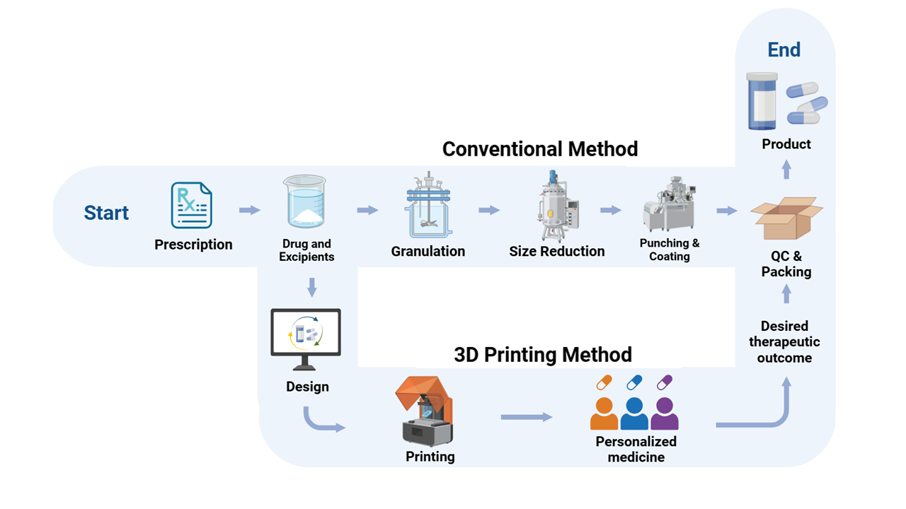 Three-dimensional printing, called additive manufacturing, creates 3D personalized pharmaceutical products layer by layer through computer-aided design (CAD) and precise material deposition. This technology allows the designing and manufacturing of sophisticated drug formulation and delivery systems specific to each patient's needs, departing from traditional 'one size fits all' to customized medications [1]. Notably, data also reveals that 75% of cancer drugs, 70% of Alzheimer's drugs, and 50% of arthritis medications have no significant therapeutic effect, highlighting the limitations of conventional treatments [2]. Conventional manufacturing methods involve multiple steps of granulation, size reduction, and coating and require huge consumption of time and resources.