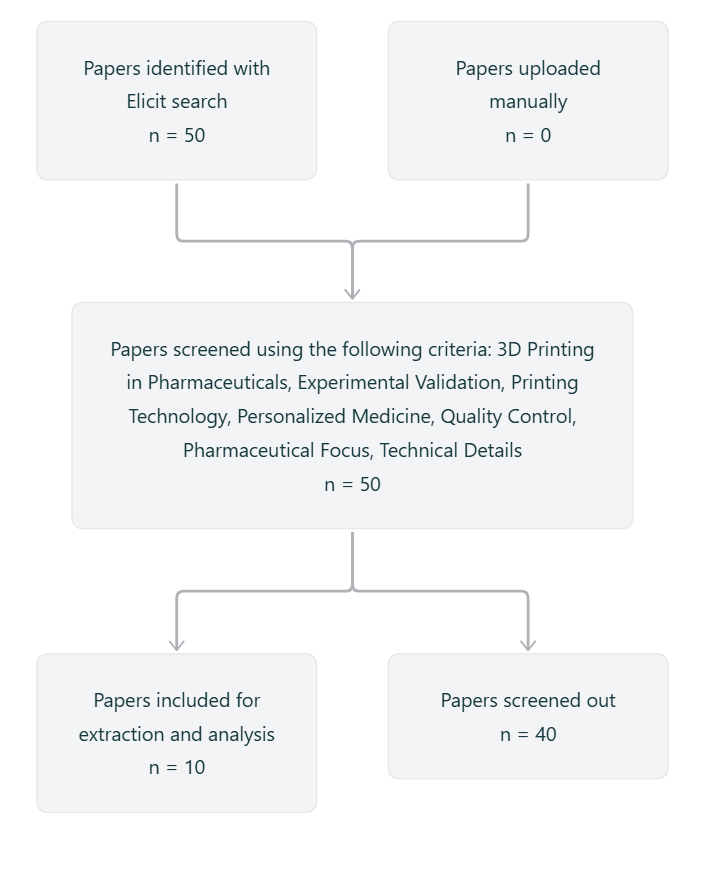 Data were collected through a structured literature search using the Semantic Scholar corpus and the Elicit tool. The search was guided by the research question, “What are the various methods of 3D printing in pharmaceutics that are being used to create personalized medicine and improve upon conventional systems?” Key terms used included “3D printing,” “pharmaceutical manufacturing,” “personalized medicine,” “Fused Deposition Modeling,” “Selective Laser Sintering,” “Inkjet Printing,” and “Binder Jetting.” We applied filters to include studies published from 2015 to 2021, ensuring relevance to current technologies. Papers were screened based on the following criteria: direct relevance to pharmaceutical 3D printing, inclusion of experimental validation or technical discussion, focus on drug formulations (not just medical devices), and applicability to personalized medicine. The 50 most relevant papers were retrieved based on the research question, focusing on studies related to 3D printing technology in pharmaceuticals. Screening criteria included relevance to personalized medicine, specific 3D printing methods (FDM, SLA, and inkjet printing), experimental validation, quality control, and pharmaceutical applications. 10 studies meeting these criteria were included for further analysis, and 40 were excluded for not meeting the criteria. The Elicit flowchart for the systematic review is presented in fig. 3.