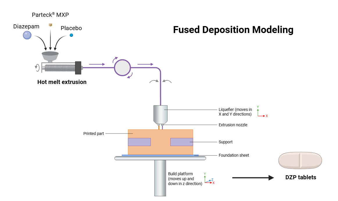 Fig. 4: Hot melt extrusion and fused deposition modelling process for diazepam tablet
