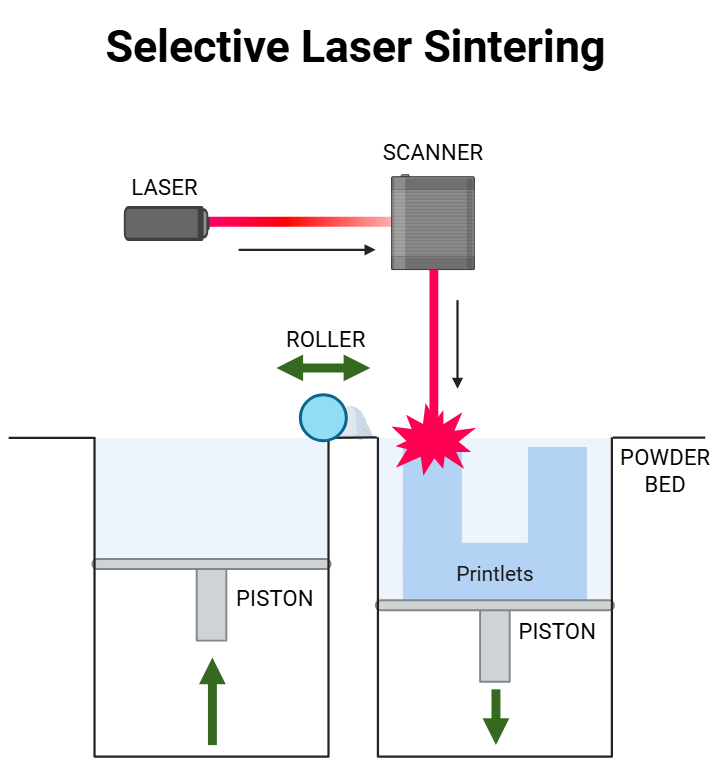 Selective Laser Sintering (SLS) is one of the emerging 3D printing technologies that has potential applications towards pharmaceuticals. The method involves laser fusion of powdered pharmaceutical materials with a blue diode laser to form complex dosage forms with specific properties, as shown in fig. 5. In SLS, the powder is heated to a temperature just below the melting point of the drug, thereby facilitating the transition of the drug from a crystalline to an amorphous state, which can improve dissolution rate and bioavailability [38, 39]. Advantages of SLS for rapid prototyping are solvent-free processing, minimal post-processing, and porous structures for rapid disintegration [40, 41]. The technique enables production of personalized medicines and amorphous solid dispersions in a single step, such as carvedilol and itraconazole, thereby improving bioavailability [38, 41, 42]. SLS can manufacture drug products with unique engineering properties and high precision [43]. Furthermore, SLS allows the production of tablets with custom release profiles through adjusting the laser scanning speeds, affecting the drug release rate, such as higher speeds increasing the release of theophylline formulations [44].