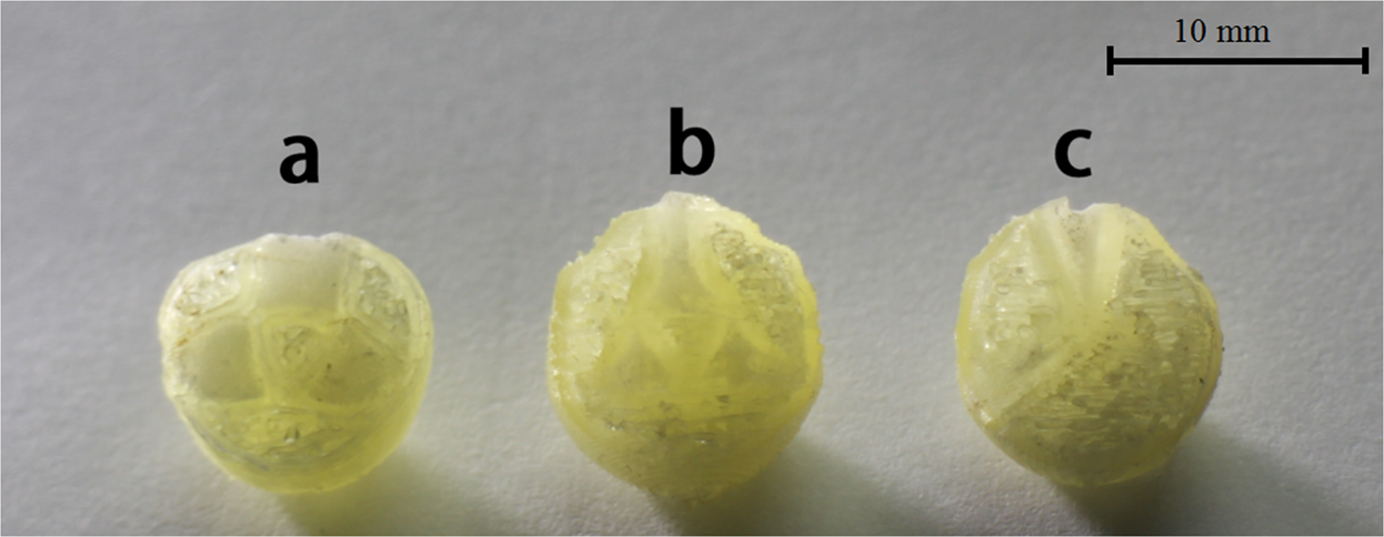 Fig. 7: 3D printed tablets (a) Cylinder model, (b) Horn model, (c) R-Horn model