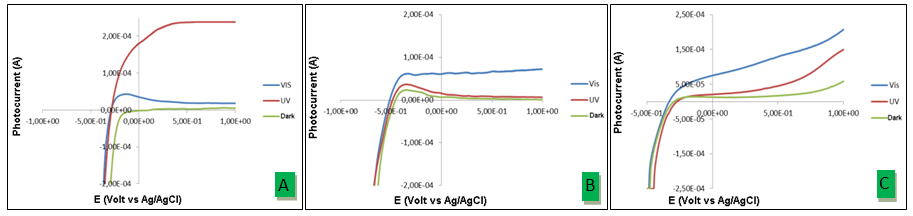 The photocurrent is the observed current when the electrode is irradiated by UV or visible light. This current is also the measurement of the transfer rate among semiconductor/electrolyte surfaces. Thus, it can be also used to measure the rate of OH radical formation on the catalytic surface. In this study, the measurement of the photocurrent as a potential function was performed by using Linear Sweep Voltammetry (LSV) technique in an electrolyte solution of 0.1 M NaNO3 connected to portable potentiostat.