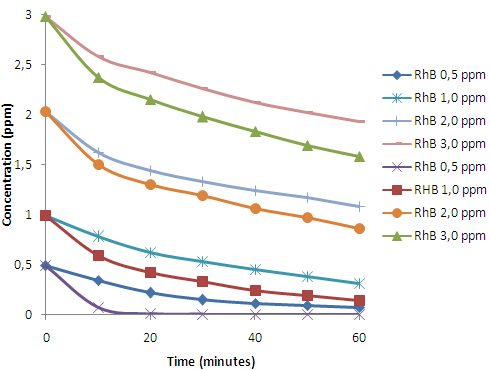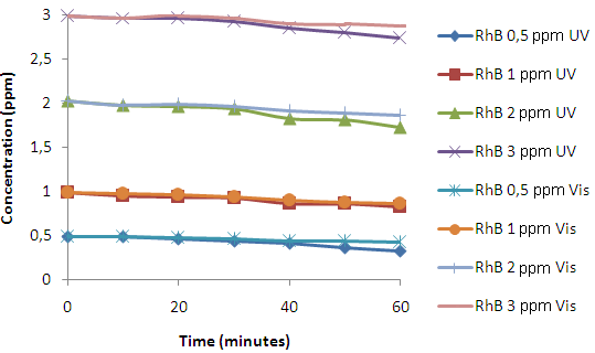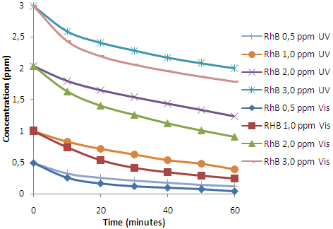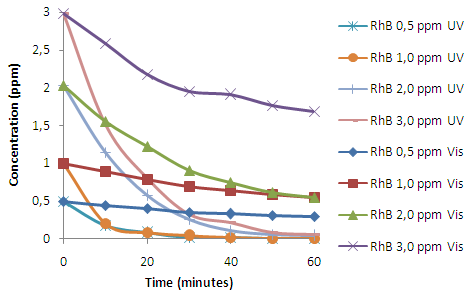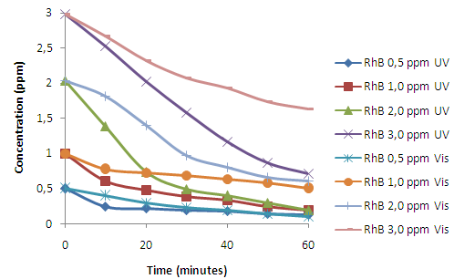 Fig. 6 shows that the concentrations of Rhodamine B when irradiated in UV and visible light photolytically decreases slowly, due to the oxidation reaction and the broken bond of Rhodamine B. According to Wilhelm and Stephan when Rhodamine B is illuminated by UV or visible light and the oxidation reactions occurs on its organic compound, the bond break in Rhodamine B occurs [28].