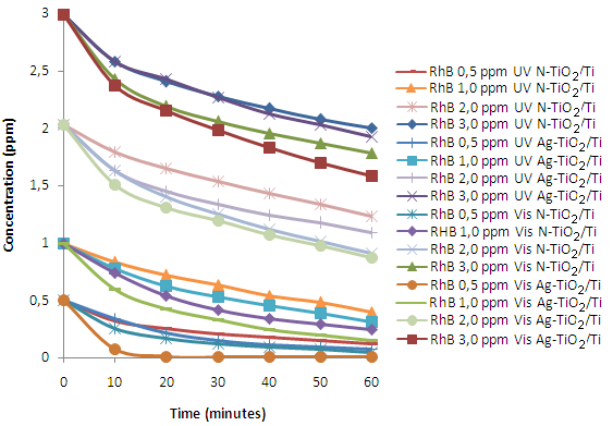 Table 1: Rhodamine B degradation rate constants for each variation of concentration with respect to irradiation of UV and visible light of TiO2/Ti, N-TiO2/Ti and Ag@TiO2/Ti in photoelectrocatalysis
