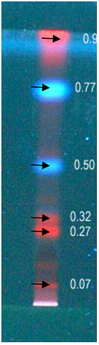 The HPTLC analysis of ethanol extract for flavonoids at 365 nm revealed 12 phyto constituents having Rf values 0.03, 0.08, 0.15, 0.18, 0.23, 0.27, 0.42, 0.57, 0.74, 0.84, 0.91, 0.98 out of which spots with Rf values 0.06, 0.27, 0.57, 0.74, 0.91 are prominent when compared to other spots.
