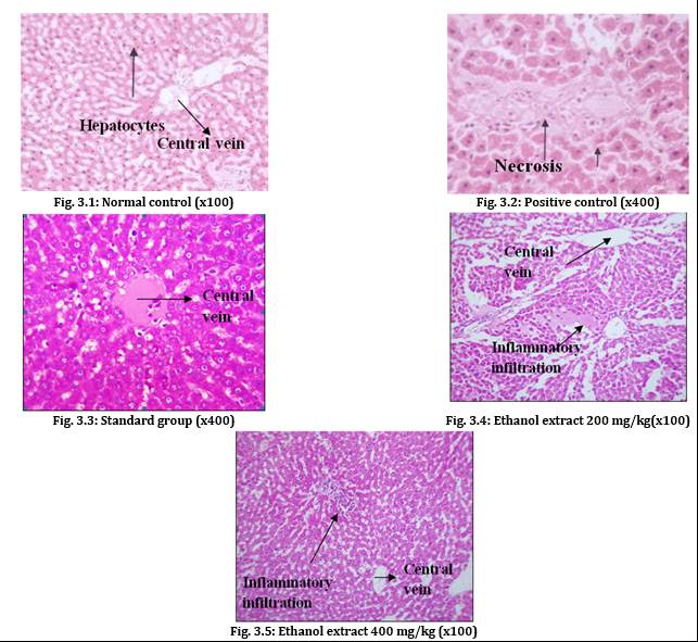 Fig. 3 shows the histopathology of livers of animals treated with paracetamol and ethanol extract. Histopathalogical profile of liver of control animals showed normal perivenular, periportal and midzonal hepatocytes (fig. 3.1). Liver section of animals treated with paracetamol showed distorted liver architecture with more hepatocytes showing degenerative changes and necrosis (fig. 3.2). The liver section of animals treated with 200 mg/kg of ethanol extract showed distorted architecture. The periportal region shows inflammatory infiltration and some of the sinusoids appear disrupted (fig. 3.4), whereas liver section of animals treated with 400 mg/kg dose showed intact architecture with normal sinusoids (fig. 3.5). The above results confirmed the hepato protective effect of ethanol extract of whole plant of S. amaranthoides in paracetamol induced hepatotoxicity in rats.