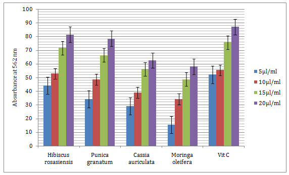 In recent years, attention has been focused on the antioxidant properties of plant-derived dietary constituents of food [35]. Our preliminary phytochemical screening of different medicinal plants (table 1) revealed the presence of flavonoids. It was reported that the petals of Hibiscus also contain gossypetin (gossypetin-8-glucoside) and gossypetin-7-glucoside [36]. In the previous report, the presence of the flavanoid is known to support the bioactivities of medicinal plants [37-39].