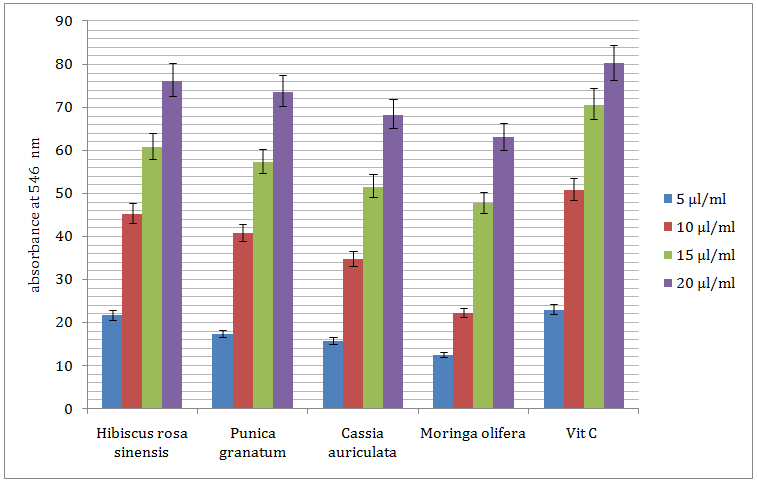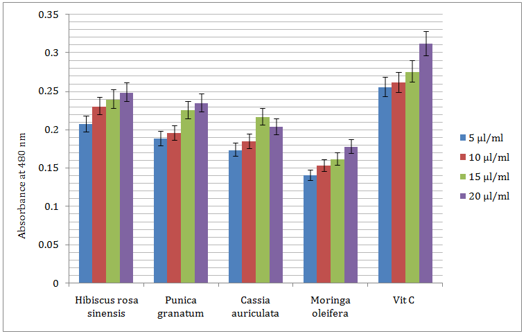 In the reducing power assay, the presence of antioxidants in the methanolic extract would result in the reduction of Fe3+to Fe2+by donation of electrons. The maximum reducing property was found at the 20 µl/ml of the methanolic extract of petals of H. Rosasinensis which was higher than the other medicinal plants (fig. 1).