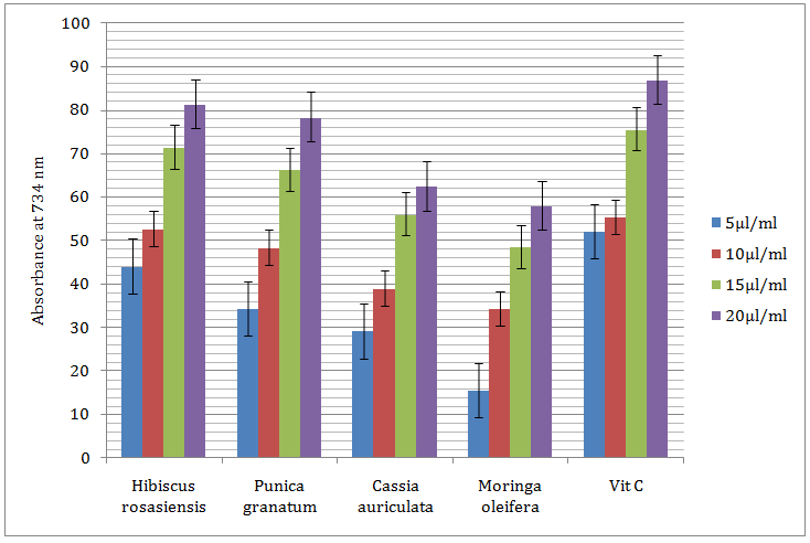 Generation of the ABTS+ radical cation(s) forms the basis of one of the spectrophotometric methods that have been applied to the measurement of the total antioxidant activity of pure substances solutions, aqueous mixtures and beverages [48]. A more appropriate format for the assay is a decolorization technique, in that the radical is generated directly in a stable form prior to reaction with putative antioxidants. The improved technique for the generation of ABTS+ involves the direct production of the blue/green ABTS+ chromophore through the reaction between ABTS+ radical cation(s) and potassium persulfate. The methanolic extract of Hibiscus rosasinensis has effective ABTS+ radical scavenging activity in a concentration-dependent manner (5 to 20 μl) (fig. 7)