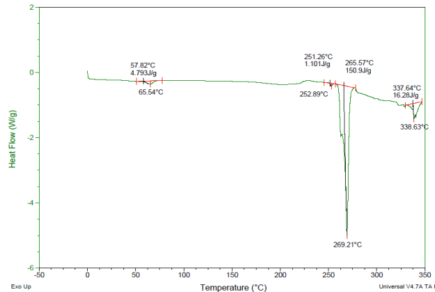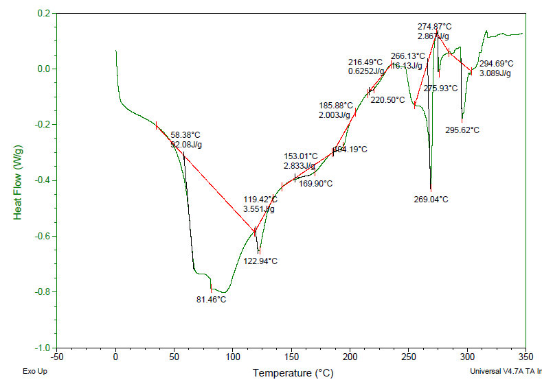 The compatibility of theophylline and the polymer blend (alginate+sesbania gum+HPC) was checked using DSC. The thermograms have been shown in fig. 1. Theophylline exhibited a sharp endothermic peak at 269.21 °C, corresponding to its melting transition point (fig. 1a). The physical mixture of drug and polymer showed three endothermic transitions peaks at 122.94 °C, 269.04 °C and 295.62 °C (corresponding to sodium alginate) as shown in (fig. 1b).