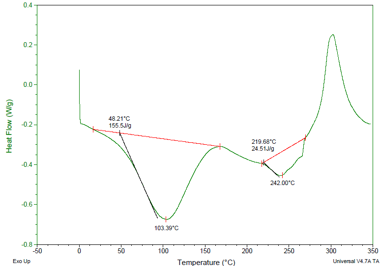 Weaker melting endotherm of theophylline appeared because the polymers might have inhibited melting of some drug crystals [11]. However, the prepared formulation of microbeads did not show any endothermic peak close to the drug melting point (fig. 1c). It may be indicated that drug was uniformly dispersed at the molecular level of polymers. But the prepared formulation showed early broad endothermic peak at 103.39 °C, probably due to evaporation of water. Hence, it may be concluded that there was no interaction between drug and excipients.