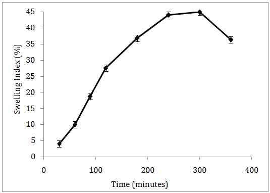 Maximum swelling of beads was noted at 6-7 h in the buffer after which erosion and breakdown took place resulting in decline in the index. Similar observations have been reported by Larson et al. [15]. Such behavior results from slow erosion of cross-linked microbeads due to a slight degradation of alginate backbone into smaller fragments [16].