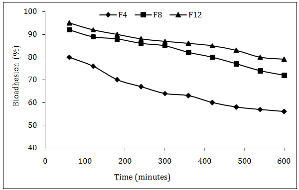 Maximum bioadhesion was shown by F12, where 3 polymers were used. This result suggested that the developed formulation has good bioadhesiveness which is desired for extended release formulations so that they do not expel from GIT before complete drug release.