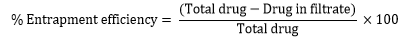 The amount of theophylline present in the filtrate after bead formation was measured and subtracted from the total amount taken initially to determine total entrapped drug. The drug entrapment efficiency (%) was calculated using the following formula: